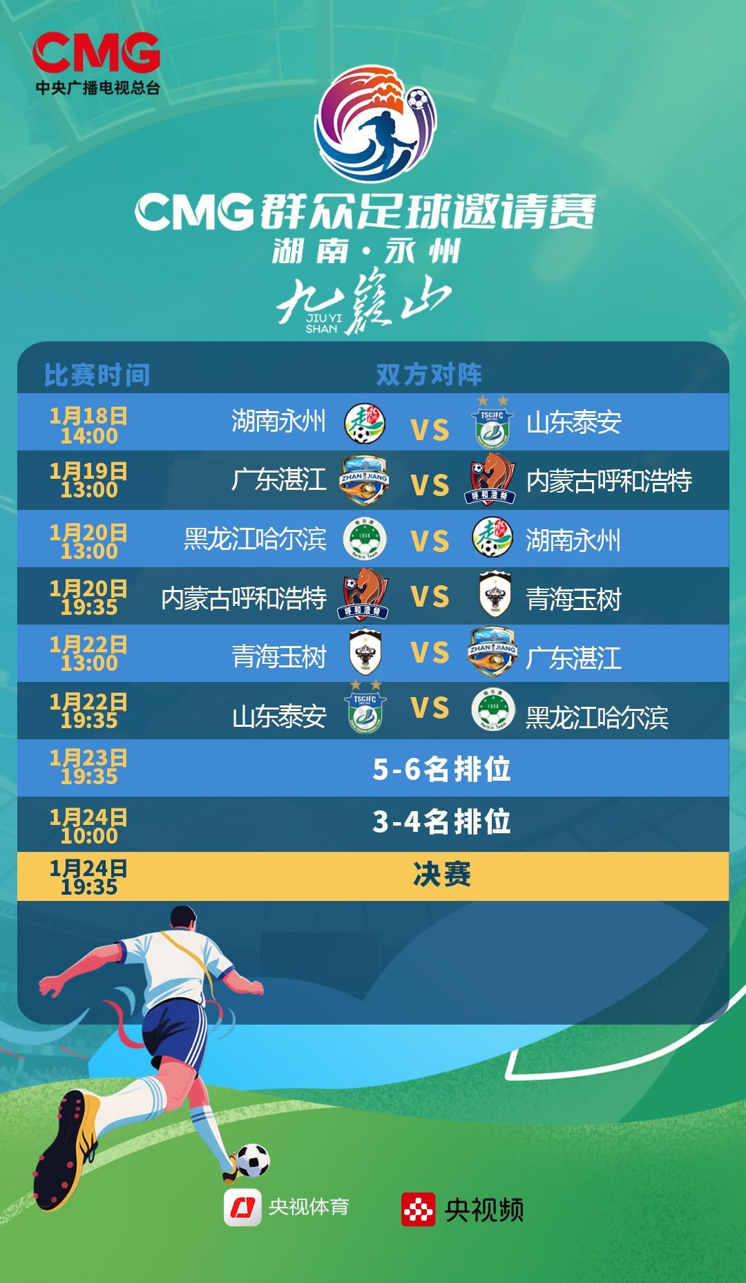 1月18日14:00,CCTV5、央视频、央视体育客户端将现场直播揭幕战,东道主“湘超”冠军湖南永州队对阵“齐鲁超”冠军山东泰安队,评论员贺炜、徐阳将在永州体育场现场搭档解说。